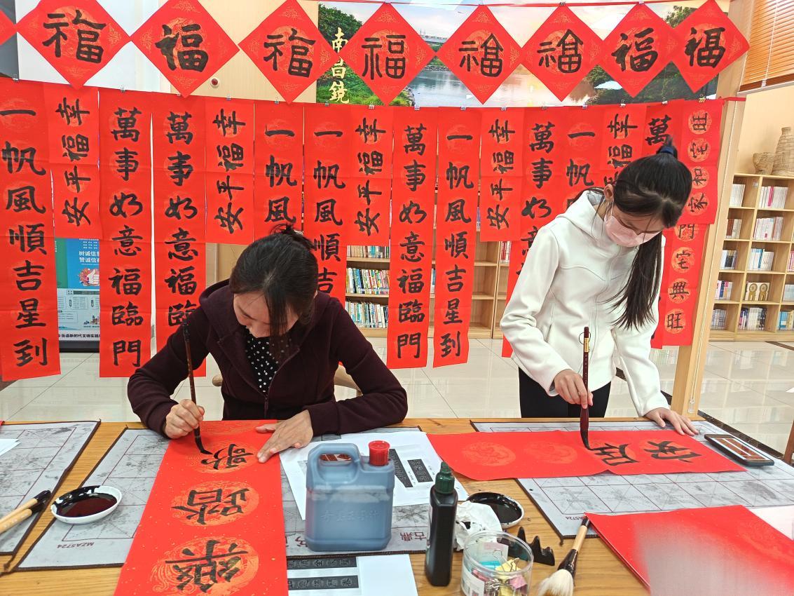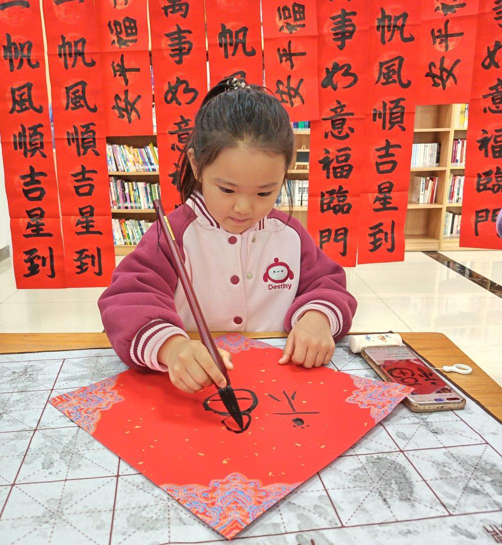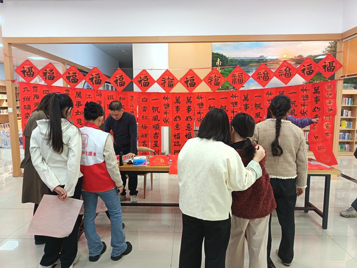 浓浓的年味在现场弥漫。自主创作区内,居民们俯身案前,专注书写。孩子握着毛笔写下稚嫩的“福”字,脸上洋溢着成就感;退休教师沉吟推敲,将对美好生活的期盼与“百千万工程”的愿景巧妙融于联句之中,以笔墨传递时代心声。爱心代写区,书法志愿者们挥毫不停,一副副满载吉祥的春联在腕底生成。两个区域间,居民们自然交流着书写心得、分享家乡年俗,欢笑声与赞叹声此起彼伏。现场完成的一百余件作品,不仅是红纸黑字,更是节日喜悦的生动载体。