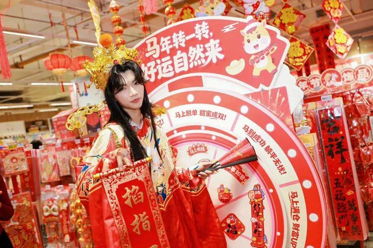 在大润发新塘店入口处的转盘互动区,围满了年轻顾客,醒目的“马上转运”字样搭配萌趣的马年生肖元素,年味十足。彩色的转盘上印着“马上发财”“马上变美”等充满网络热梗的马字谐音祝福语,顾客轻轻一转,便收获一句吉祥话,也收获一份新春好心情。