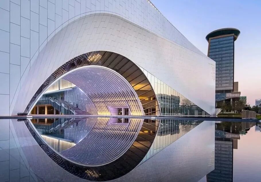 张艺谋导演的镜头为何钟情于光明?在影片的预告中,光明文化艺术中心,以其纯白流线型建筑、通透的玻璃幕墙、标志性的拱形中庭和现代化的二楼平台空间,成为国安干警暗夜追踪间谍的关键场景的视觉载体,为影片注入了独特的现代美学气质,碰撞出更丰富的文化叙事。