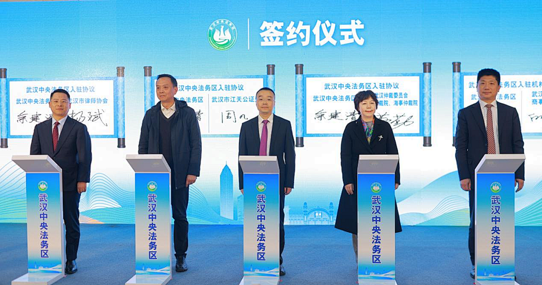 揭牌仪式上,武汉市司法局、武汉仲裁委员会办公室、江汉区政府签订武汉中央法务区共建协议。
