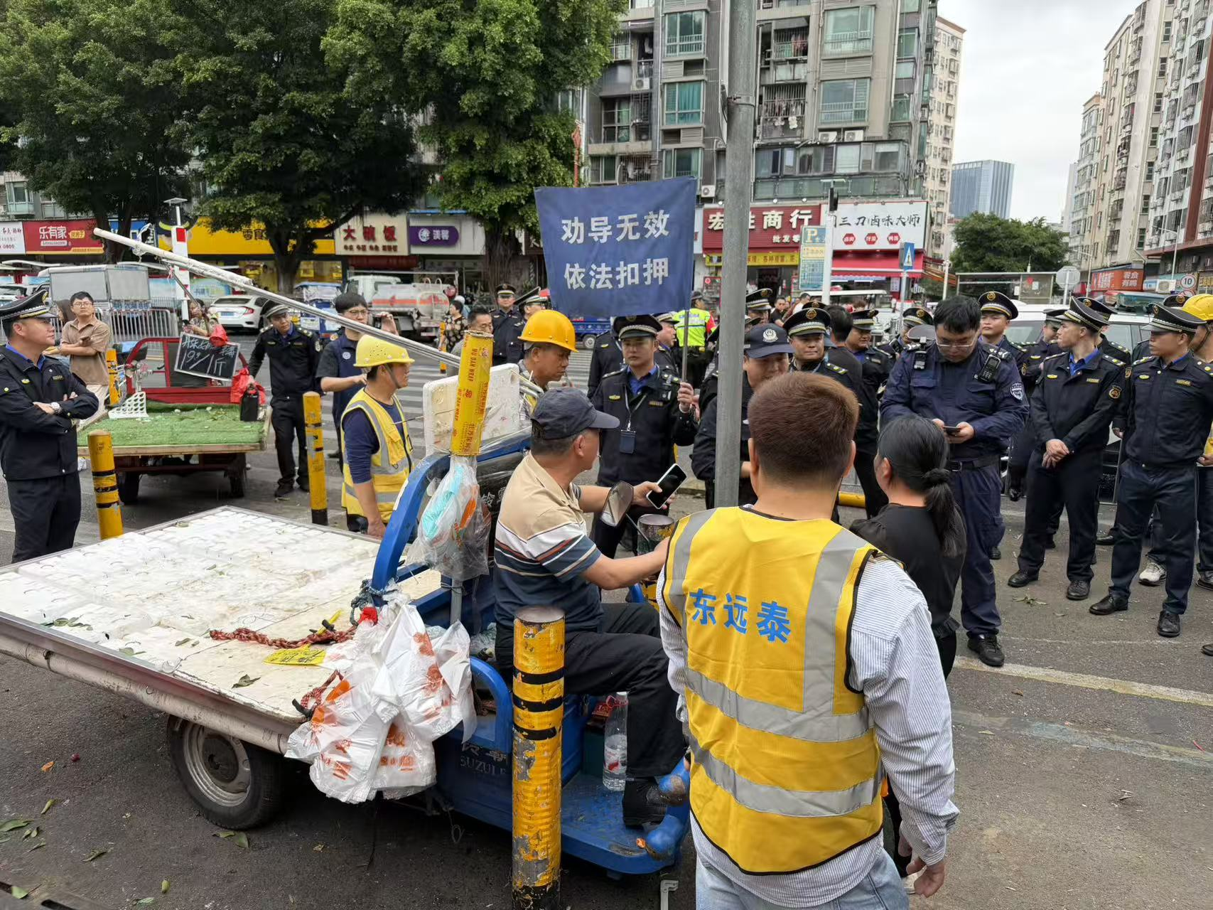 在整治现场,执法队员坚持普法先行,手持宣传旗帜,利用扩音设备循环宣讲城市管理法规,引导商户群众自觉守法。面对乱摆卖等市容乱象,执法队果断出击,当次行动共整治乱摆卖18宗,依法暂扣违规电动三轮车7辆、手推车1台,有效肃清了重点区域环境秩序。