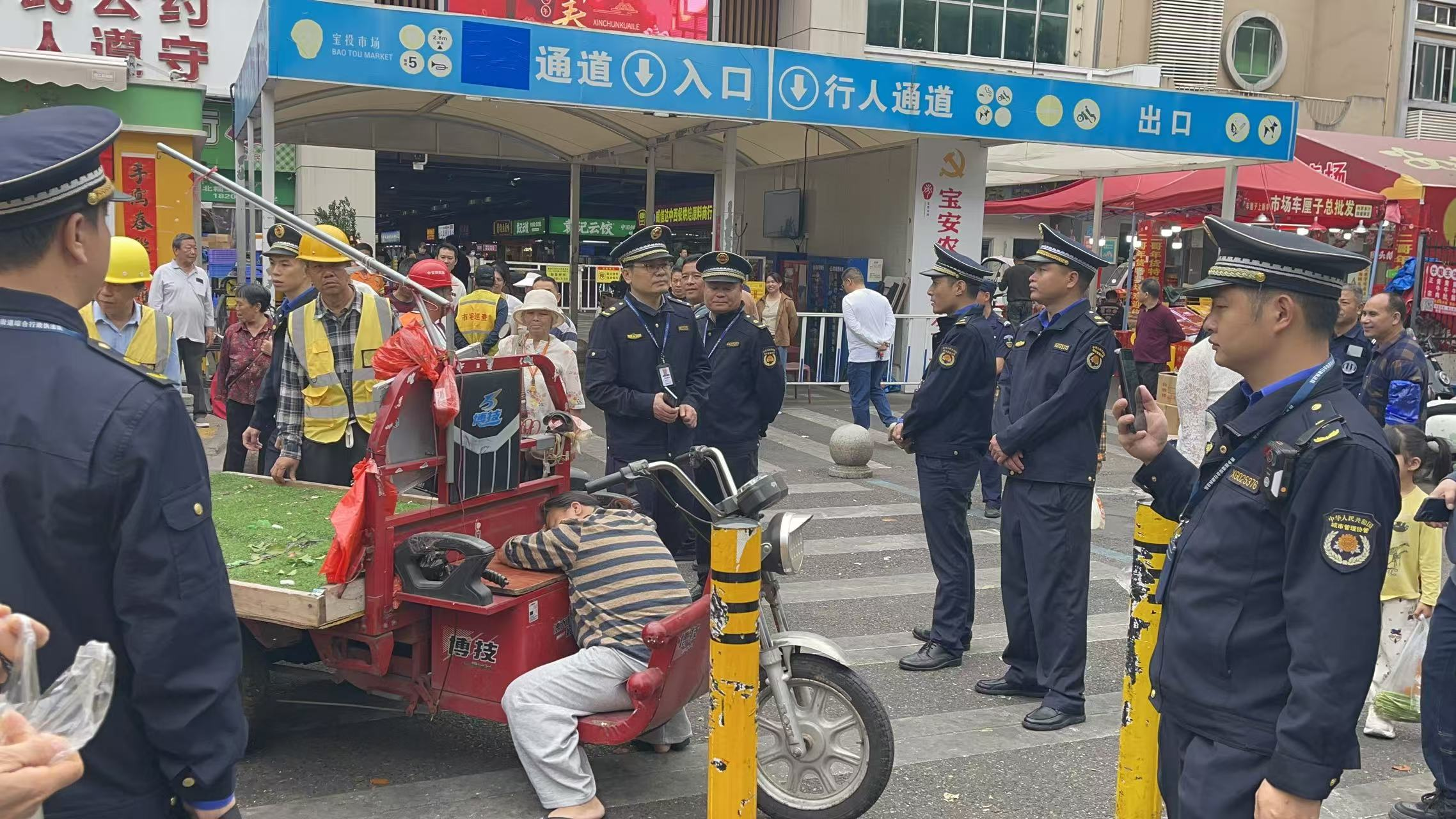考验来自突发状况。在西乡立交桥底,一名当事人在三轮车被暂扣时情绪失控,不仅多次试图驾车冲撞逃离,更手持遮阳伞打砸车辆,严重威胁执法人员安全。面对暴力抗法,队员们沉着冷静、坚守底线,在控制涉事车辆的同时,其余队员持续进行法规解释与情绪疏导,最终平稳完成处置。在宝安农批市场周边,3名当事人盘踞车上拒不配合,甚至在执法人员依法劝离后,有一名当事人躺地“碰瓷”企图阻挠。执法人员在派出所民警见证下,全程录像,依法警告并移离当事人、暂扣车辆,对“碰瓷”行为保持高度克制,直至120人员到场处置完毕。这两起事件的处理,充分体现了执法队伍“法不容情,执法有度”的专业素养,在坚决打击违法违规行为的同时,牢牢守住了文明规范的执法底线。