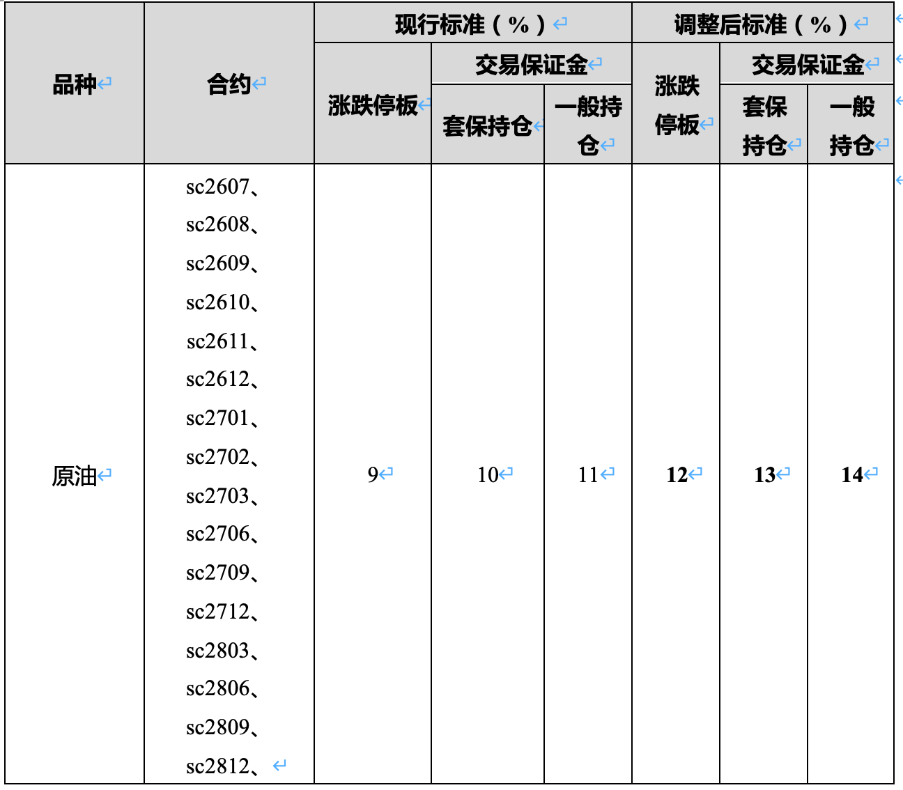 原油期货sc2607、sc2608、sc2609、sc2610、sc2611、sc2612、sc2701、sc2702、sc2703、sc2706、sc2709、sc2712、sc2803、sc2806、sc2809、sc2812、sc2903合约涨跌停板幅度为12%,套保持仓交易保证金比例为13%,一般持仓交易保证金比例为14%。
