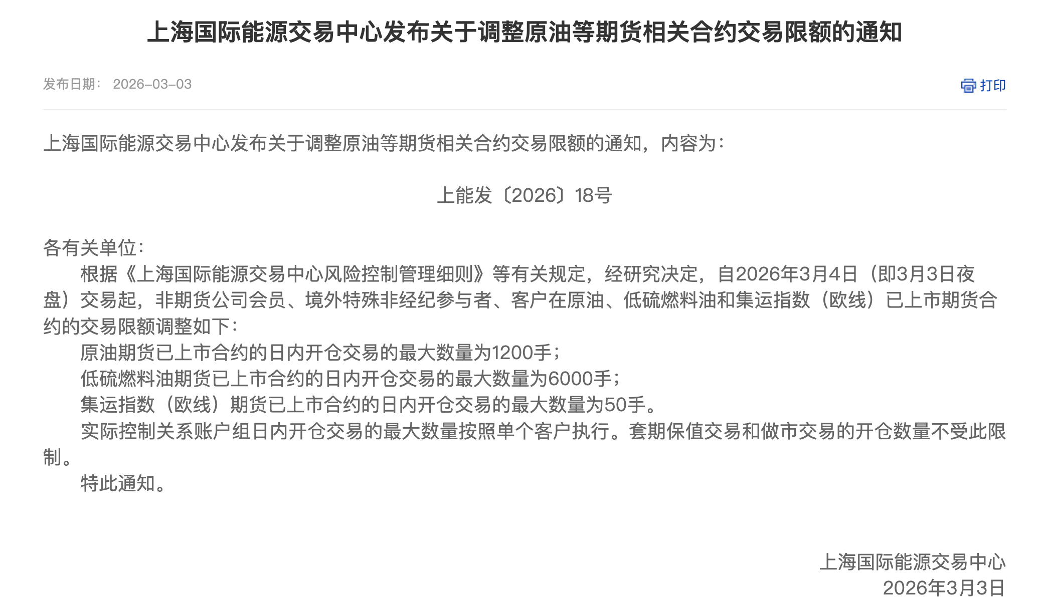 上期能源通知称,自2026年3月4日(即3月3日夜盘)交易起,非期货公司会员、境外特殊非经纪参与者、客户在原油、低硫燃料油和集运指数(欧线)已上市期货合约的交易限额调整如下: