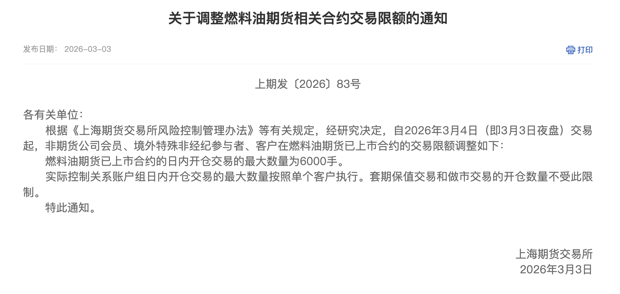 针对市场的大幅波动,上海期货交易所3月3日晚发布通知称,自2026年3月4日(即3月3日夜盘)交易起,非期货公司会员、境外特殊非经纪参与者、客户在燃料油期货已上市合约的日内开仓交易最大数量为6000手。