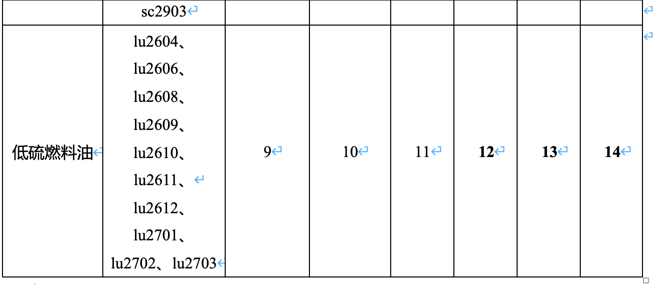 低硫燃料油期货lu2604、lu2606、lu2608、lu2609、lu2610、lu2611、lu2612、lu2701、lu2702、lu2703合约的涨跌停板幅度为12%,套保持仓交易保证金比例为13%,一般持仓交易保证金比例为14%。