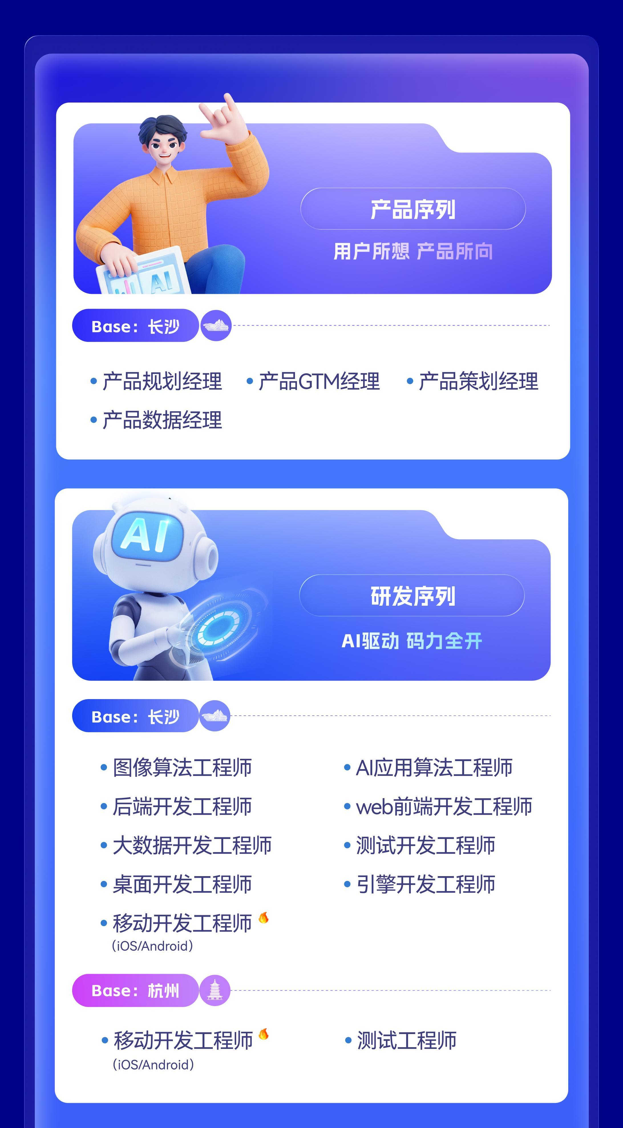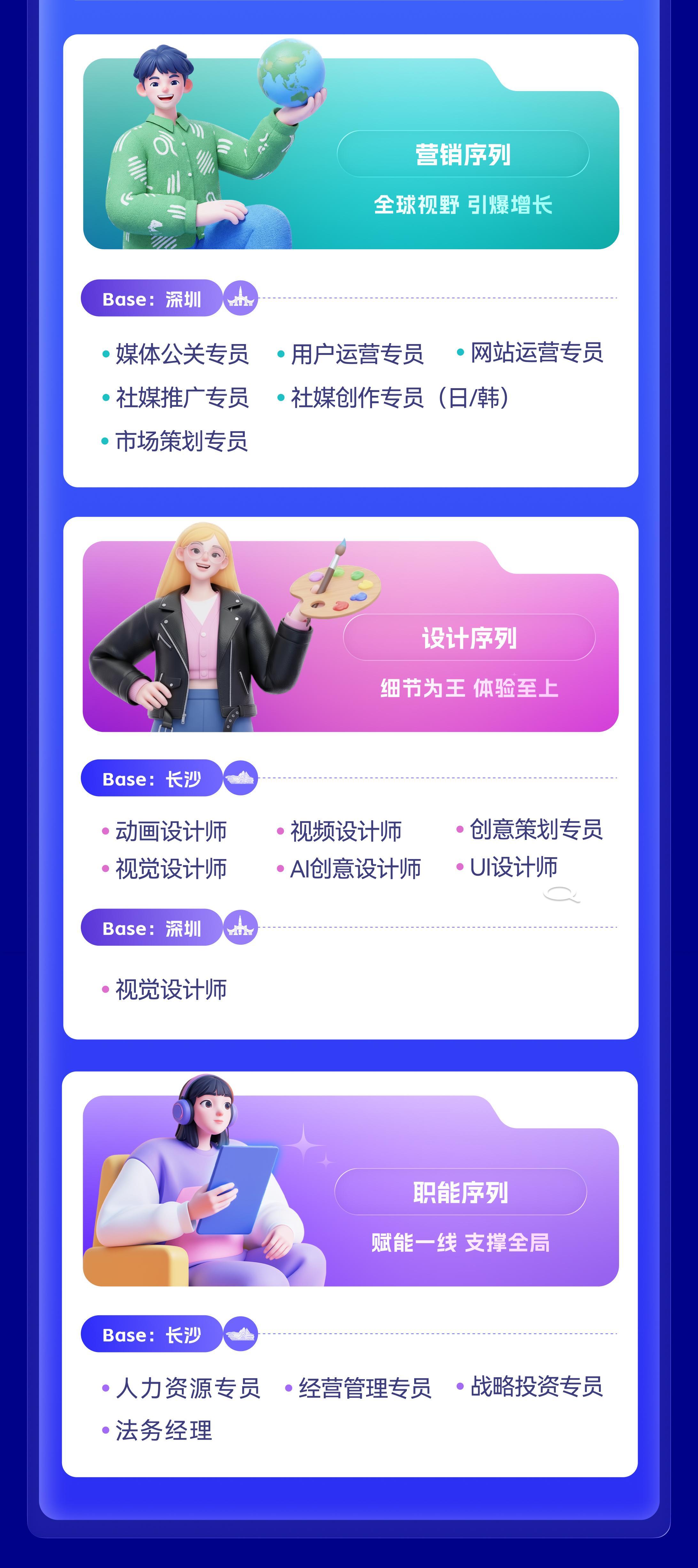 本次春季补录岗位全面覆盖公司核心业务链条。产品类重点招聘产品规划经理、产品GTM经理、产品策划经理等;研发类补录聚焦图像算法工程师、AI应用算法工程师、移动开发工程师(iOS/Android)等岗位;营销类涵盖媒体公关专员、用户运营专员、网站运营专员等;设计类开放动画设计师、视频设计师、创意策划专员、视觉设计师等;职能类包括人力资源专员、经营管理专员、战略投资专员和法务经理等。