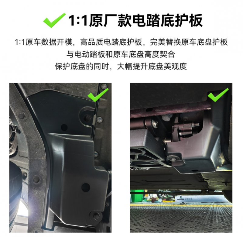 睿麟拒绝“通用款”,秉持1:1原车开模理念,深入探究纯电版问界M7/M8的研发逻辑,凭借1:1原车数据开模,为这两款车型量身打造电动踏板,不仅实现了无损安装(全车不打孔、不破线、原装位安装),更通过核心技术——替换式底护板解决了底盘干涉问题。安装后的底盘平整度超越原厂,完整保留空气动力学特性,既保护底盘又提升整体美观度。