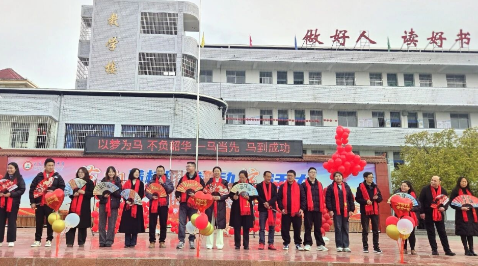 活动伊始,教师代表们身着盛装,手持折扇和气球,以昂扬的姿态为全体师生送上新学期的祝福。电子屏上 “以梦为马 不负韶华 一马当先 马到成功” 的标语,点燃了师生们奋进的热情,也为即将奔赴中考战场的学子们注入了信心与力量。