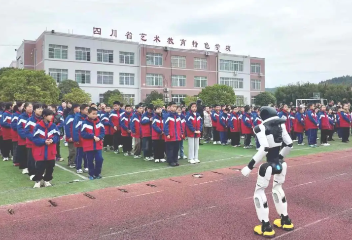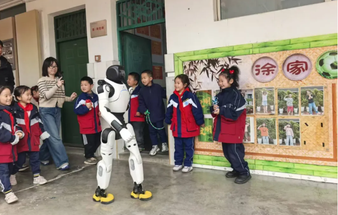 典礼结束后,机器人还走进教室与学生进行亲密互动。孩子们簇拥在机器人身旁,好奇地观察、兴奋地交流,欢声笑语为学校增添了浓厚的科技趣味与活力。
