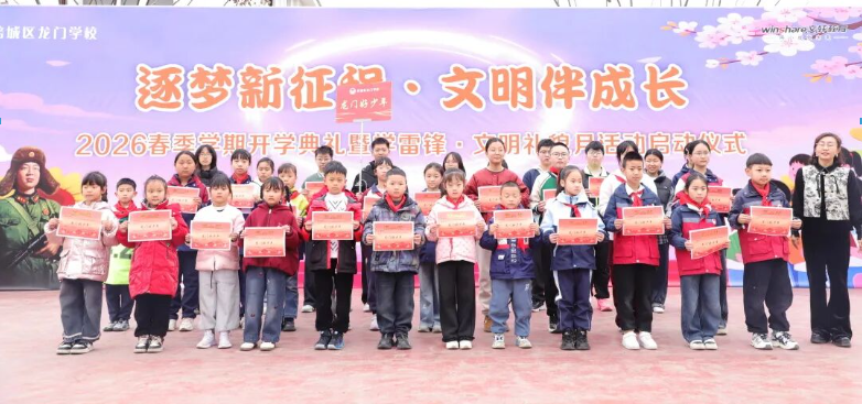 龙门学校于3月2日举行2026年春季开学典礼暨学雷锋·文明礼貌月活动启动仪式。典礼由少先队辅导员章雪梅老师主持,以“逐梦新征程,文明伴成长”为主题,激励全体师生以崭新面貌、昂扬姿态开启新学期,共筑文明、和谐、向上的校园新风尚。