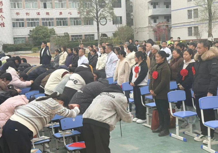 百日磨剑,今朝试锋!初三分管领导登台致辞,明确中考冲刺目标,解读百日备考关键节点,为初三学子指引方向。全体初三学子在领誓人的带领下庄严宣誓,右手高举、字字铿锵,面向国旗与家长席,喊出不负韶华、决胜中考的必胜信念。随后,学子们转身向家长与教师行拜谢礼,感恩养育之恩,感念教诲之情,温情与敬意在现场流淌。
