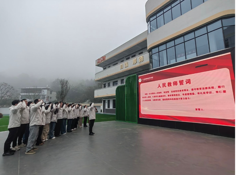 师生宣誓环节振奋人心。全体教师与学生分别高举右拳,以铿锵誓言许下恪守师德、立志笃学的庄严承诺。