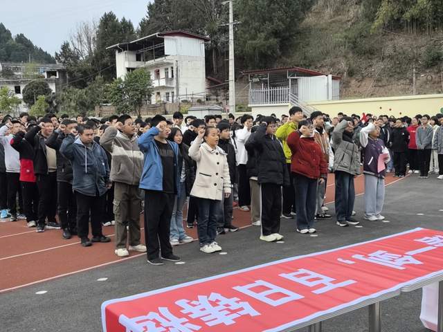 大会在庄严的升旗仪式中拉开帷幕。护旗手身着统一制服,步伐铿锵,仪容庄重。在雄壮的国歌和轰鸣的鞭炮声中,鲜艳的五星红旗冉冉升起,全体师生肃立行注目礼,爱国情怀与奋斗豪情在每个人心中激荡。
