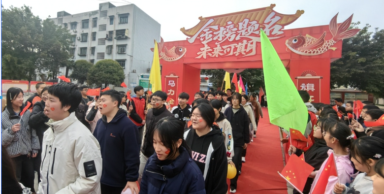 上午8时,激昂的《钢铁洪流进行曲》在校园中奏响,仿佛是出征的号角,九年级学子们携着横幅,迈着坚定的步伐昂首入场。他们的脸上洋溢着青春的朝气和对未来的憧憬,那整齐的队伍,如同即将奔赴战场的勇士,充满了斗志。紧接着,庄严隆重的升国旗仪式开始,国歌声响彻整个校园,每一位师生都怀着崇敬的心情,注视着国旗缓缓升起。这不仅仅是一个简单的仪式,更是对国家的热爱和对未来的期许。