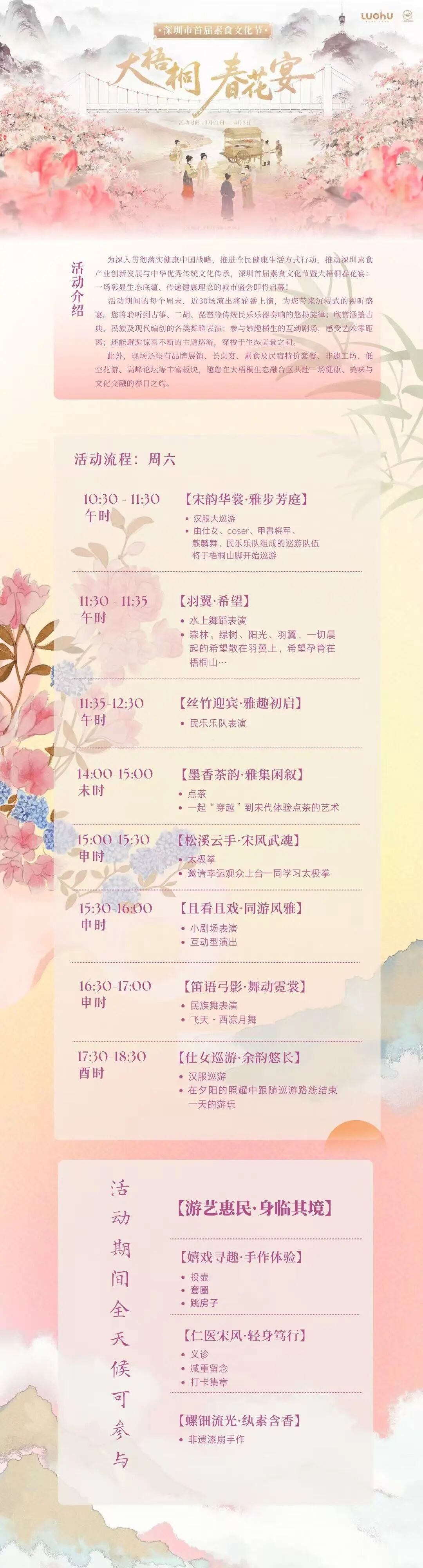 以花为主题,打造户外沉浸式素食长桌宴。现场同步上演民乐演奏、特色舞蹈等文艺节目,在静谧雅致的氛围中赏景用餐,打造罗湖生态文旅消费新场景。
