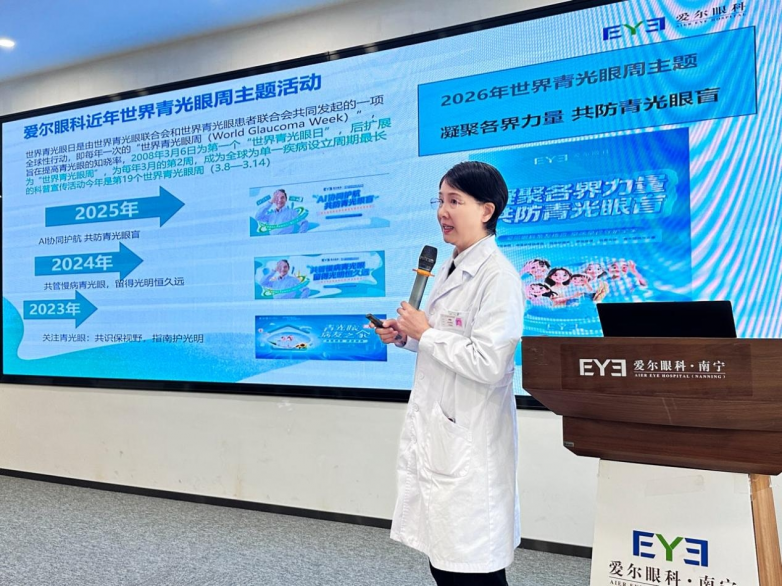 第19个世界青光眼周(3月8日—14日)期间,为积极响应“凝聚各界力量,共防青光眼盲”的活动主题,切实提升公众对青光眼的认知与主动防控意识,3月11日上午,南宁爱尔眼科医院成功举办青光眼科普教育讲座,吸引近100名市民到场参与,以专业医疗力量守护群众光明“视”界。