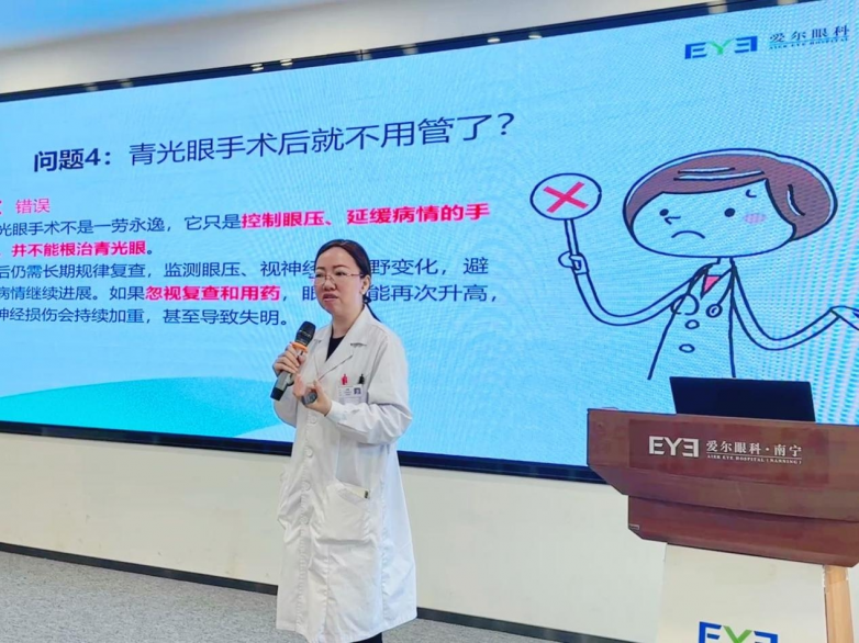 活动现场,爱尔眼科广西区总院长李莉围绕青光眼防治知识展开深度分享,南宁爱尔眼科医院白内障及青光眼专科副主任王瑛则聚焦市民常见认知误区逐一答疑,两大专家联动为市民搭建起专业、易懂的青光眼防治知识桥梁。