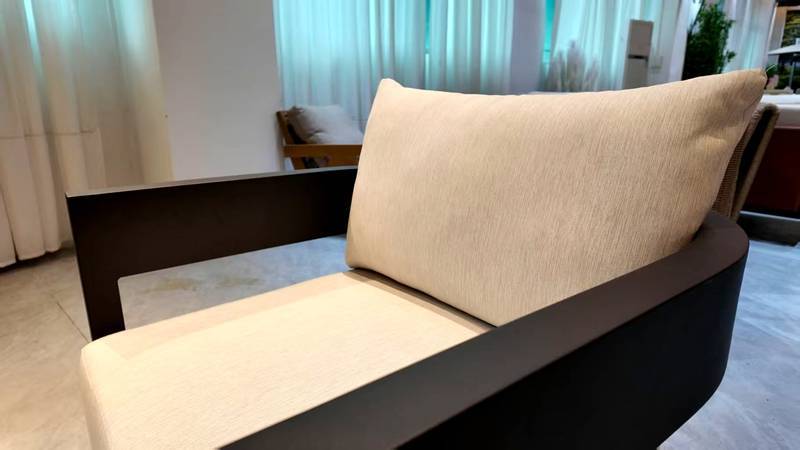 软包搭配上,TYLER系列选用米白色专业防水面料,靠背与坐垫饱满厚实、舒适透气,既能有效抵御户外风雨、潮气,又具备防霉易清洁的优势,日常打理省心便捷。米白色软包与深灰色铝合金框架形成经典的色彩对比,视觉上干净通透,自带高级质感,让户外空间摆脱沉闷,更具层次感与设计感。