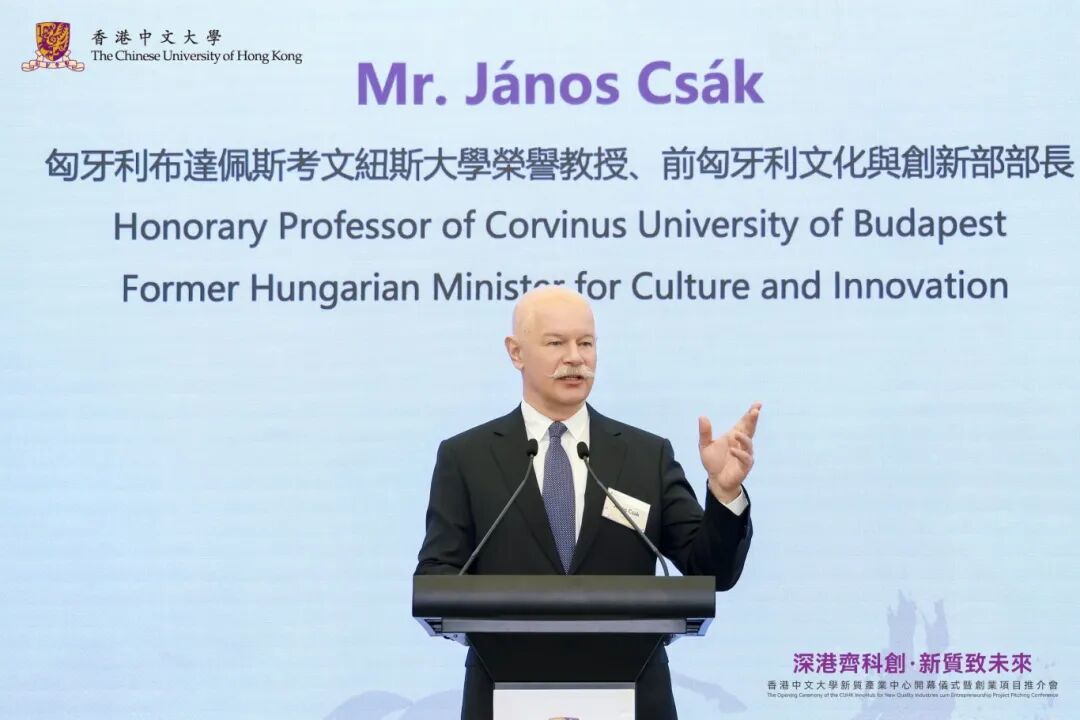 合作机构代表、布达佩斯考文纽斯大学荣誉教授、前匈牙利文化与创新部部长János Csák对港中大新质产业中心的开幕表示祝贺。他指出,匈牙利与中国历史上长期保持著友好关系,因为这种关系是建立在相互尊重的基础之上。新技术为进一步深化匈牙利与中国的大学及机构间的合作提供了新的机会。匈牙利致力于成为欧洲主要的研究与创新枢纽,聚焦于数字化、生命科学及绿色转型领域。布达佩斯考文纽斯大学考文纽斯高等研究院与港中大深圳研究院依託“学术科创矩阵”平台展开合作,是基于港中大经验与成就、旨在推动人才交流与联合研发的重要举措。我们承诺在未来几年支持这一措施,并期待双方在港中大新质产业中心的平台上深化合作。