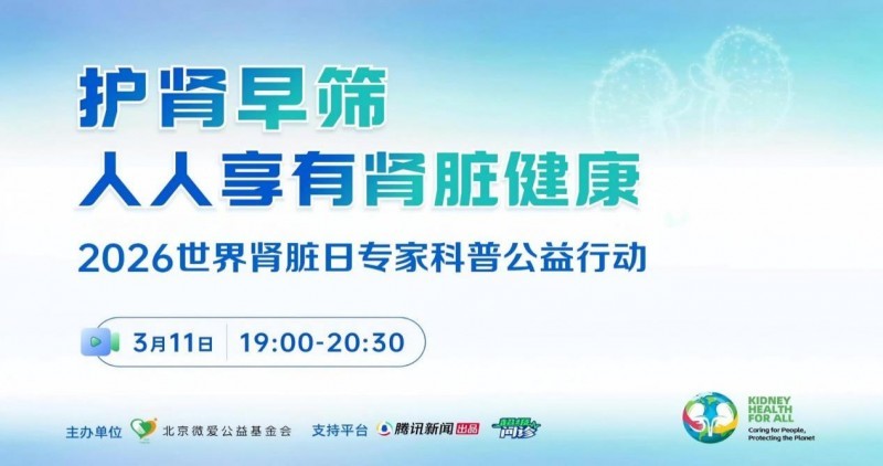 2026年3月12日是第21个世界肾脏日,今年的主题为“人人享有肾脏健康:关爱生命,守护地球”。为响应国际肾脏病学会(ISN)倡议,由北京微爱公益基金会发起,全国多家三甲医院内分泌科共同参与的“护肾早筛·人人享有肾脏健康——2026年世界肾脏日公益行动”,通过KIM-1超早期肾损伤检测技术,为600名糖尿病高危人群提供免费筛查服务,推动肾脏病防治关口前移,让早筛早治惠及百姓。