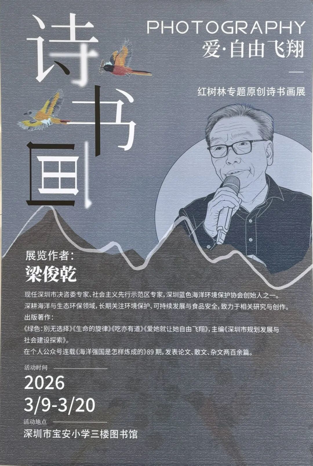 诗书画展的创作者梁俊乾先生是红树林的长期守望者与记录者,他以细腻笔触捕捉自然真意——通过数十年如一日的细致观察,将红树林中的灵动鸟类、生机盎然的生态景象,转化为饱含深情的散文、诗词,以及笔墨淋漓的书法与绘画作品,为这片 “海上森林” 赋予了深厚的人文温度与艺术生命力。