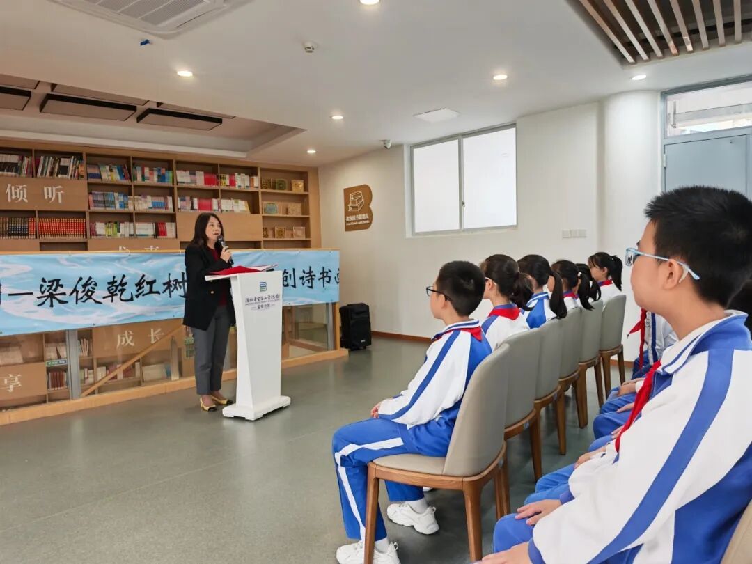 宝安小学(集团)党委书记李唯发表致辞,她热烈祝贺巡展启幕,诚挚感谢创作者梁俊乾先生的分享与付出,并勉励学子们潜心品鉴、深入探究,在诗书画中感悟自然之美,在实践交流中厚植环保初心,成长为全面发展、富有担当的新时代少年。最后,李书记期望诗书画展能在集团各校顺利开展,让红树林保护的理念与艺术之美浸润每一颗童心。