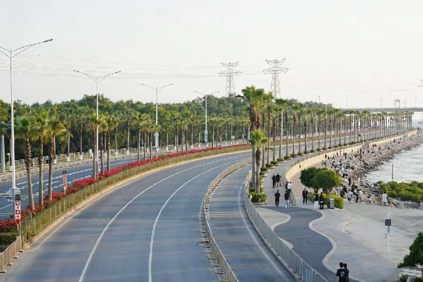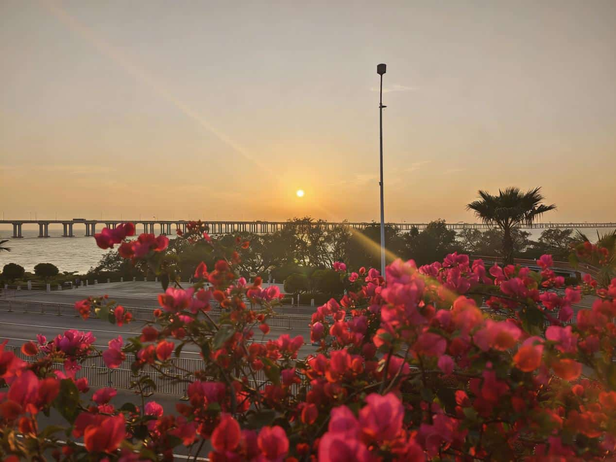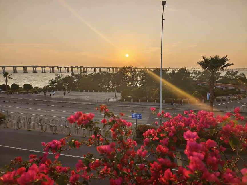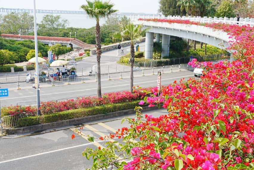 这片花海是城市动态美的绝佳注脚。地铁11号线列车穿花而过,钢铁律动与柔美花枝刚柔并济;广深沿江高速如银龙蜿蜒,车流动态与静谧花火动静相宜。簕杜鹃以热烈色彩柔化了交通设施的冷硬,实现“车在画中行”。驻足云帆天桥远眺,碧海、长桥、掠空飞机与夕阳金辉交织,红色花海在其中熠熠生辉,构成“海陆空”一体的梦幻立体画卷,成为市民争相打卡的“城市客厅”。
