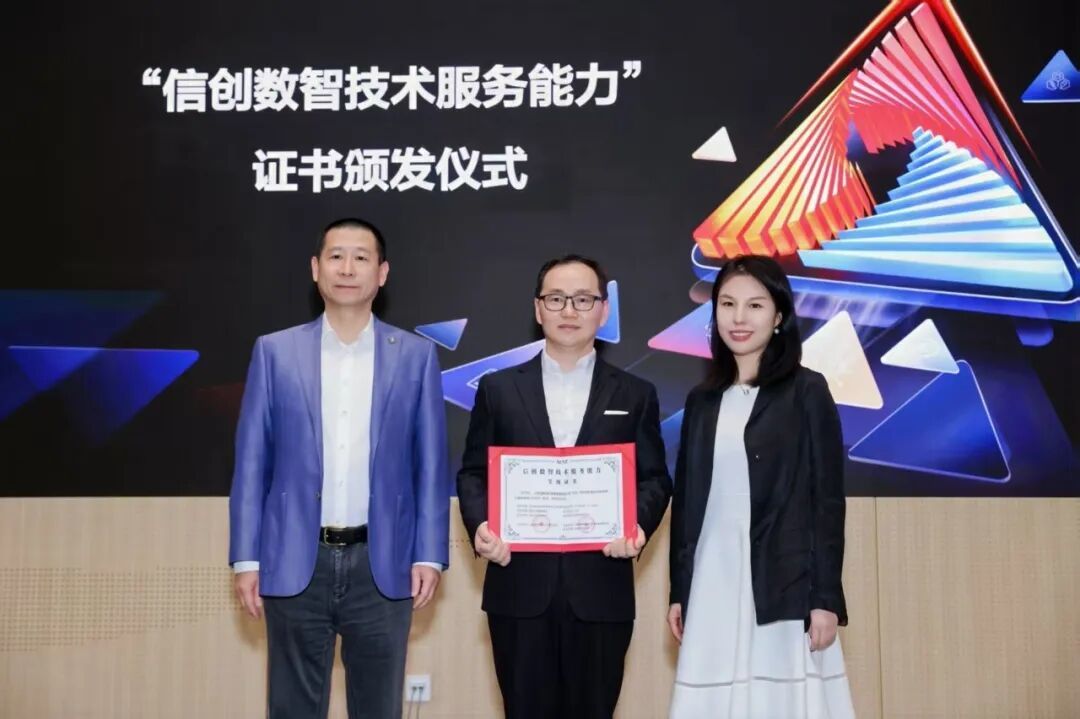 在发布会尾声,举行了“信创数智技术服务能力”证书颁发仪式。中国通信学会信创技术专业委员会秘书长齐云菲女士、中国软件评测中心认证评估事业部总经理戚泉先生共同为中软国际副总裁钟山先生颁发证书。