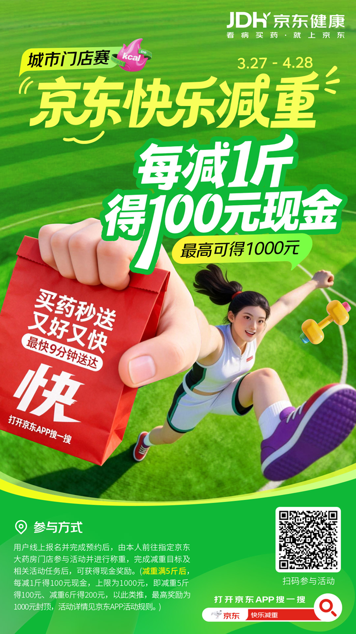 在“体重管理年”国家战略深入推进、全民健康意识持续提升的背景下,体重管理已从个人选择上升为社会共识。3月27日,继去年首期活动取得热烈反响后,京东买药秒送“快乐减重”活动重磅回归。此次活动范围由北京一城扩展至北京、上海、广州、深圳、天津五大城市,以“减一斤给100元现金”的直观激励方式,鼓励更多人迈出科学减重的第一步。依托医药供应链、互联网医疗服务和AI技术构建的一站式科学体重管理能力,京东买药秒送正将健康管理从理念转化为可触达、可执行的日常行动。
