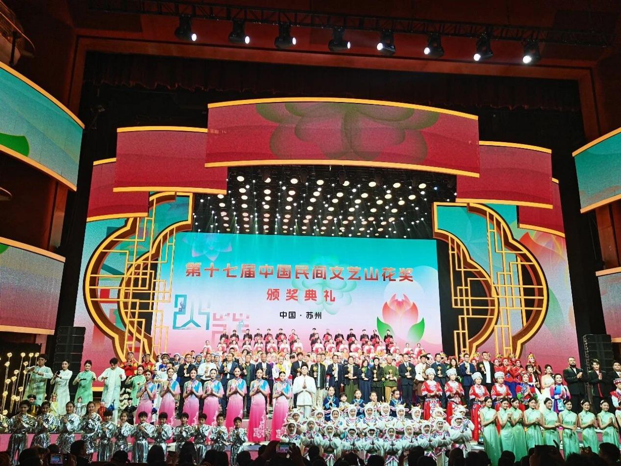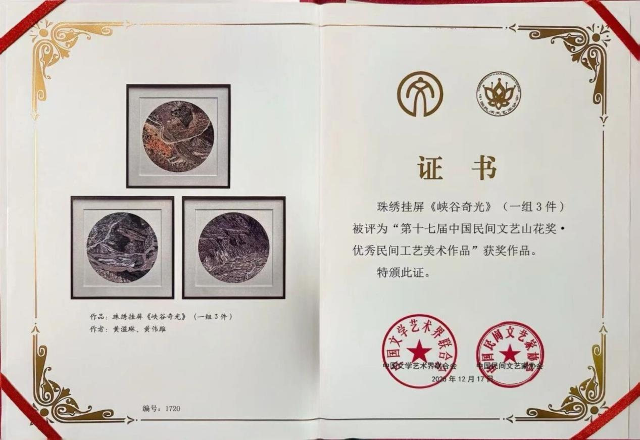 2026年3月30日,第十七届中国民间文艺山花奖颁奖典礼在苏州文化艺术中心大剧院举行。由深圳市民协选送的珠绣作品《峡谷奇光》荣获“山花奖·优秀民间工艺美术作品”奖,作者黄溢琳、黄伟雄出席颁奖典礼并领奖。