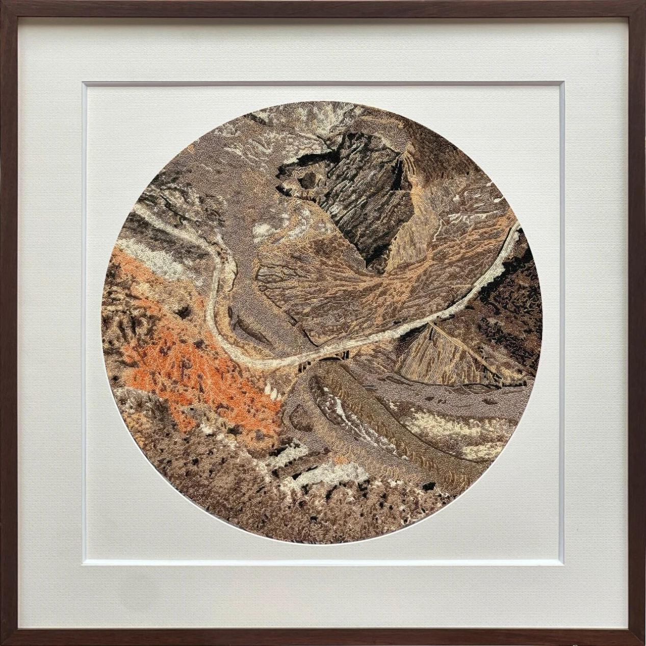 《峡谷奇光》系列以精细小圆珠为主要材料,创新传统珠绣的题材与表现手法。作品以新疆大峡谷岩壁局部的肌理、色块与光影为切入点,通过圆珠色彩的变化与多种技法的组合,以珠粒的光泽与层叠,捕捉并呈现岩壁的纹理与色彩流动。尤为特别的是,作品在虚与实、抽象与具象之间游走,营造出富有节奏感与空间感的画面,体现了传统技艺与当代艺术理念的有机融合。该系列作品曾于2024年10月在深圳博物馆同心路馆展出,并获第八届深圳民间工艺精品展金奖。