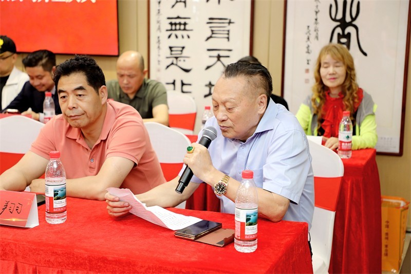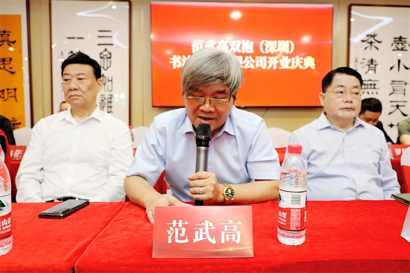 深圳市北师大教育集团发展有限公司董事长裴来文致辞中表示:“双袍”二字,藏文脉于方寸,寄匠心于千秋,既承载着大红袍、大金袍所代表的书画艺术界至高盛誉,彰显精益求精的匠人风骨与传承中华经典艺术的责任担当,是对传统文化精髓的坚守与赓续;又蕴含《诗经》“岂日无衣,与子同袍”的深厚雅意,饱含以文会友、同心共济的胸襟,秉持以文化为纽带,汇聚同道英才、传承华夏人文韵脉的初心。文化为基,匠心致远。衷心祝愿范武高双袍文化公司承古韵、启新篇,坚守文化根脉,绽放艺术风华,开业大吉,骏业鸿开,文脉绵长,誉满九州!