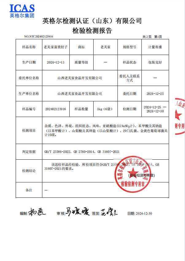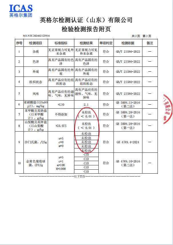 老关家的匠心,从来不是停留在口号里的坚守,而是写进权威质检报告里的硬核承诺。企业以121℃高温蒸汽杀菌技术为核心支撑,在苯甲酸及其钠盐、山梨酸及其钾盐等防腐剂未检出(<0.01g/kg)的前提下,实现了肉制品的长效保鲜。高压蒸汽可杀灭食材中99%以上的细菌、霉菌等微生物,从根源切断了食材变质的诱因,真正做到了无需依赖防腐剂,让“不添加”不再是营销话术,而是英格尔检测认证(山东)有限公司出具的《检验检测报告》中可追溯、可验证的事实。
