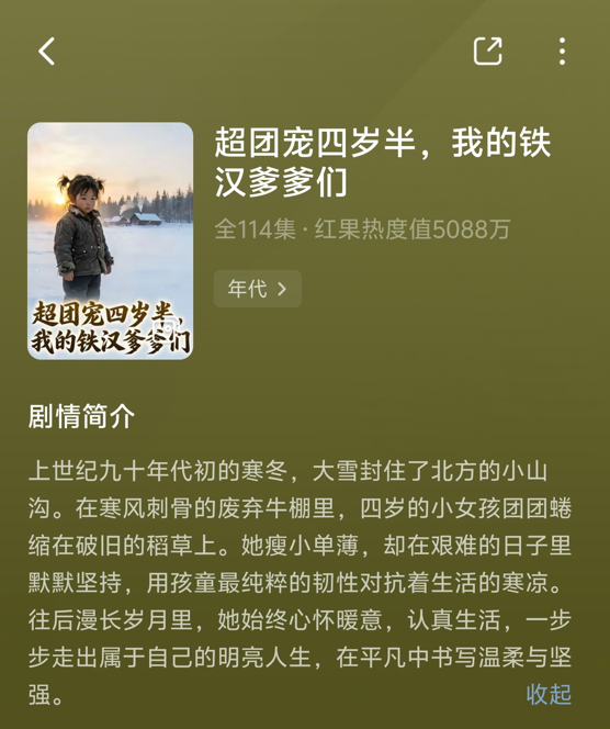 该剧以真人漫剧形式呈现,单集时长1-3分钟,全剧共114集。作品聚焦亲情、成长与韧性,以小女孩团团的视角展开,用细腻的情感表达和真实的情境还原,打动了大量观众。不少用户在评论区表示“看哭了”“想起了自己的童年”“温暖又有力量”。