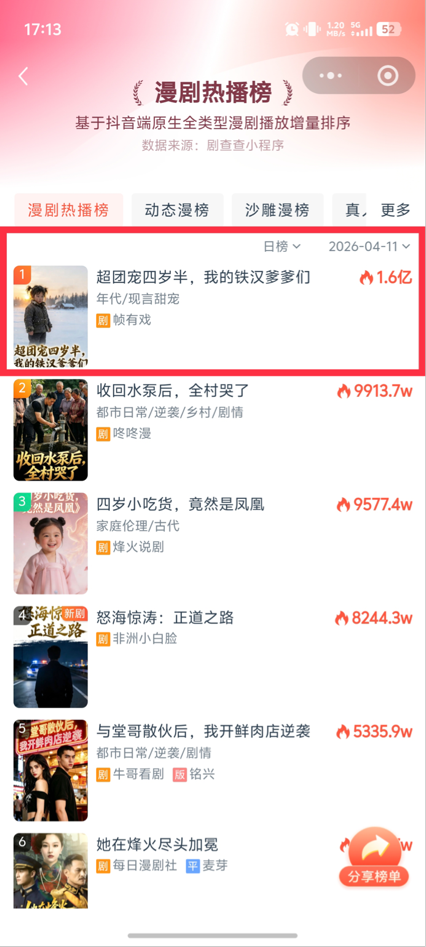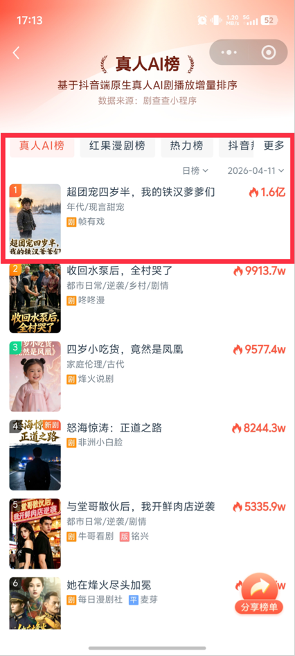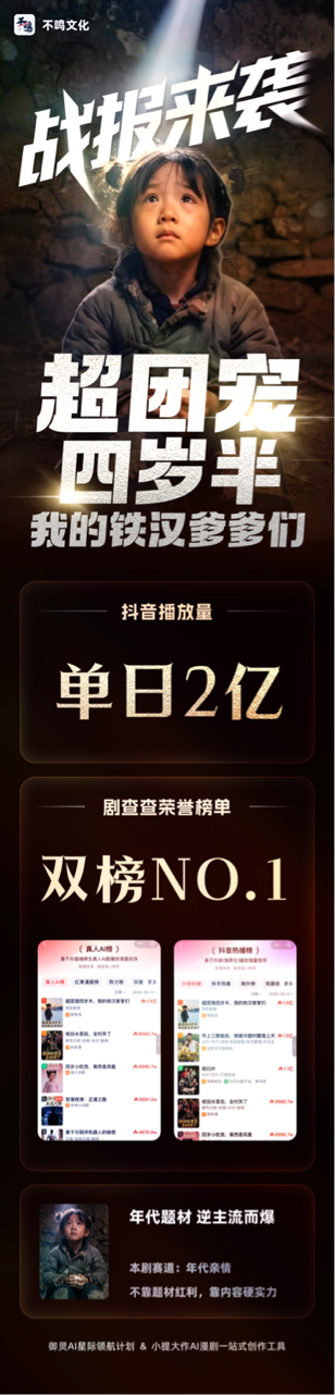 2026年4月10日,不鸣文化自制AI真人漫剧《超团宠四岁半,我的铁汉爹爹们》正式上线,迅速登顶抖音热播榜单。截至4月12日,该剧抖音累计播放量已达2.5亿,单日最高播放量突破2亿;红果平台热度值达5088万,累积收藏量超9万。据剧查查数据显示,该剧已斩获荣誉榜单双榜NO.1。