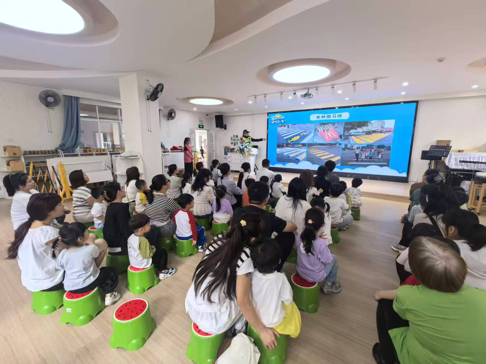 活动现场,交警同志结合幼儿年龄特点和家庭日常出行常见场景,精心准备了图文并茂的PPT课件,用通俗易懂的语言,向在场的幼儿和家长详细讲解交通信号灯、斑马线等常见交通标志的含义,以及上下学、接送孩子时的出行安全规则。讲解过程中,交警还不时与幼儿、家长互动提问,引导双方主动思考、积极回应,让幼儿快速掌握基础交通常识,也让家长进一步明确自身监护责任。
