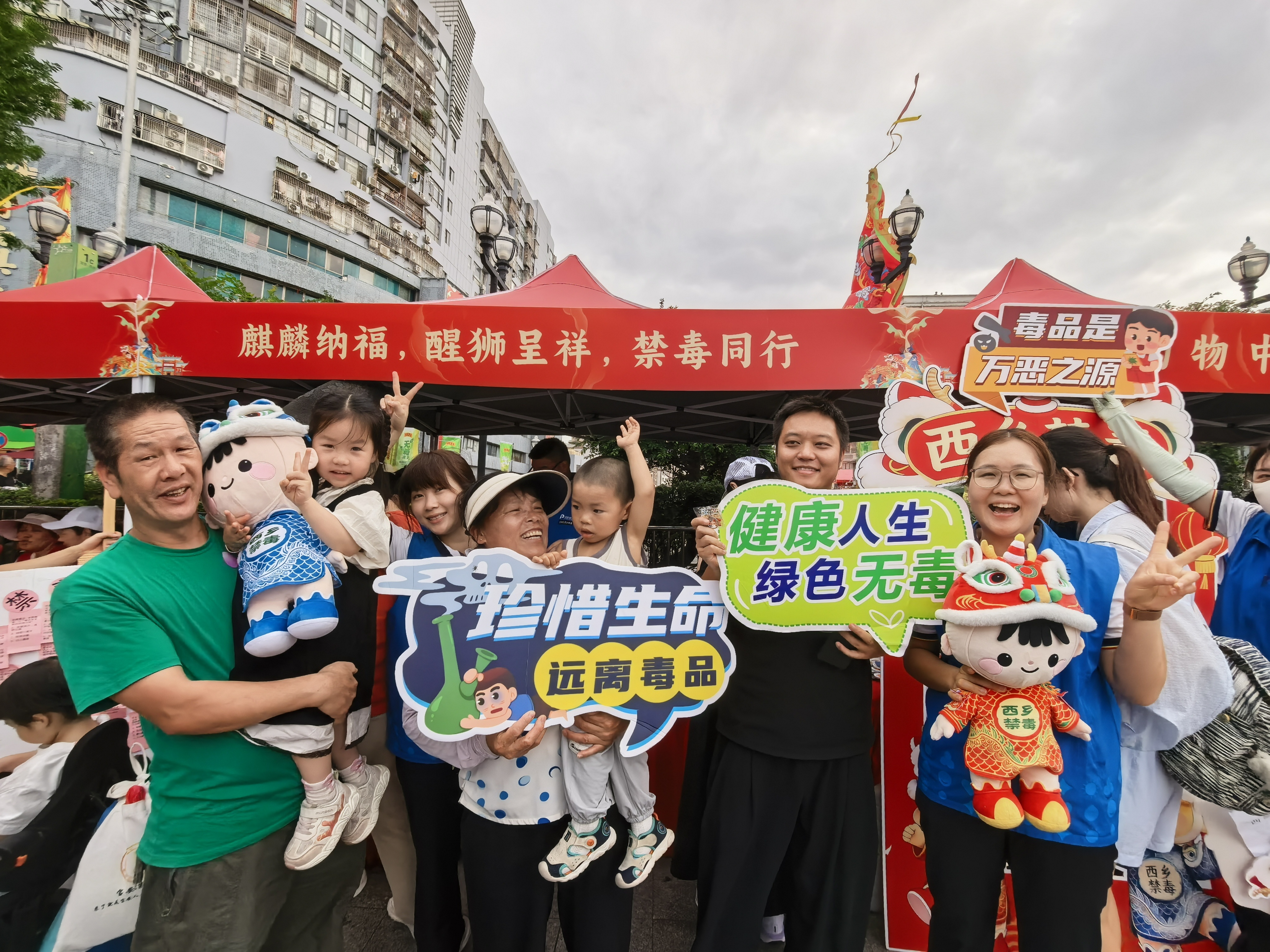 作为承载着近五百年历史的省级非遗盛会,本届庙会规模盛大、人气高涨,巡游队伍沿西乡河碧道前行,民俗表演精彩纷呈,吸引大湾区及全国各地游客前来观赏,为禁毒宣传搭建了广阔平台。现场全新亮相的西乡禁毒IP“西西”“乡乡”备受瞩目,该IP设计理念源于西乡三月三庙会醒狮麒麟非遗文化,以可爱亲民、正气昂扬的形象亮相,巧妙融合地域文化与禁毒守护理念,一经登场便成为打卡热点,让禁毒宣传更接地气、更具感染力。