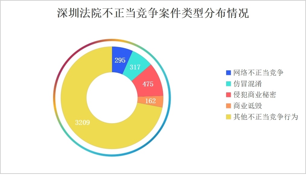 其中,审结仿冒混淆类不正当竞争案件317件,占比7.1%;审结侵犯商业秘密类案件475件,占比10.6%;审结商业诋毁类案件162件,占比3.6%;审结网络不正当竞争类案件295件,占比6.4%;审结虚假宣传、商业贿赂、不正当有奖销售等其他类型不正当竞争案件3209件,占比71.9%。
