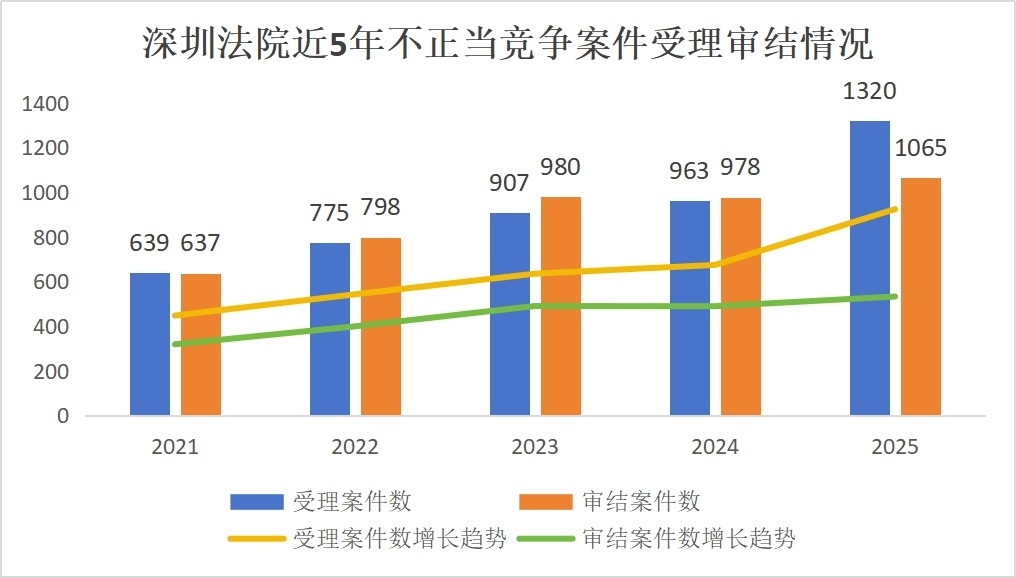 会议介绍,近年来,市中级法院落实党中央关于加强知识产权保护、维护公平竞争市场秩序的决策部署,依法妥善审理了一批社会关注度高、规则引领性强的不正当竞争案件,在明晰竞争行为边界、稳定市场主体预期、优化法治化营商环境等方面取得显著成效。2021-2025年,深圳法院共受理不正当竞争案件4604件,审结4458件,年均增长率为26.6%。