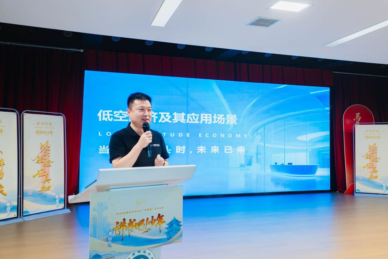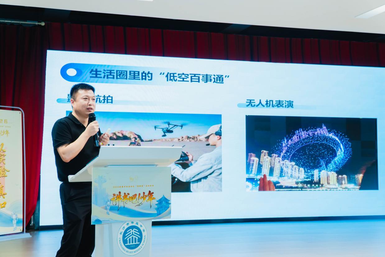 活动的后半程,话题转向《低空经济及其应用场景》里的“飞天”科技。湖南省无人机行业战略发展研究院院长,湖南省低空经济协会党支部书记、副会长、标准委员会主任,正高级工程师戴旺先生来到现场,与同学们面对面交流。他没有堆砌专业术语,而是用通俗易懂的语言告诉大家:当我们抬头望向天空,除了云朵和飞鸟,还能看见什么?空中快递、无人机灯光秀、电网巡检……这些“从天而降”的科技正在悄悄改变我们的生活。