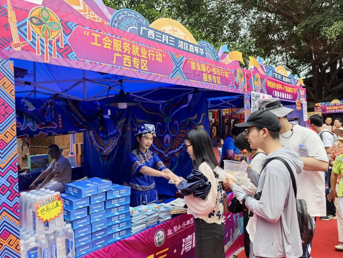 本次活动不仅是一场文化盛宴,更是一场好物惠民盛会。活动期间,粤桂协作·桂字号-广西品牌天下行展销会同步亮相,深圳对口协作的广西22个县(市)“桂品入湾”展位一字排开,从特色农产品、手工艺品到文创好物,一站式购遍壮乡好物,让湾区市民足不出深,就能把广西味道、广西好物带回家。在粤桂文旅推介专区,广西山水奇观文旅资源、针对大湾区游客的优惠政策以及具有浓郁民族风情的非遗好品,吸引游客纷纷驻足围观,更是引来众多香港游客问询。在“工会服务就业行动”广西专区、“就业暖心·桂在行动”服务专区、法律宣传咨询专区,“面对面”了解广西就业创业优惠政策和优质招聘岗位,“一对一”的法律咨询更是让合同纠纷、工伤维权、工资拖欠等急难愁盼问题得到专业律师耐心解答,让本次活动既有民族节庆的欢喜,又有关系民生的温情。