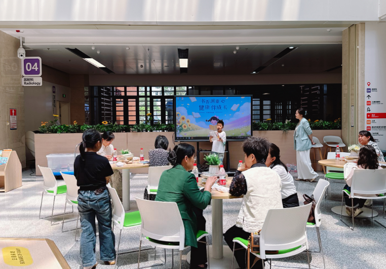 随后,孩子们在书房一角踊跃分享自己最爱的故事。从翻开书页的懵懂好奇,到勇敢登上小小的“分享台”,从亲子共读的温馨陪伴,到现场响起的一阵阵掌声——文字化作桥梁,连接起孩子与世界、孩子与父母、患者与医护。